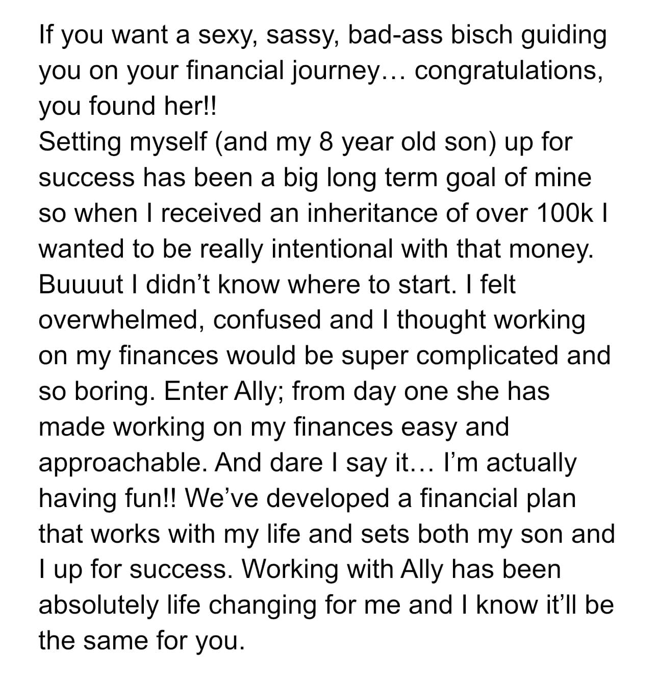 Financial literacy is the key to improving your mental game and breaking through limiting beliefs and engrained patterns that keep you from achieving financial wealth — and it's my job to to help you adopt organization, strategy, and clarity in your finances to create wealth for yourself and your family!
